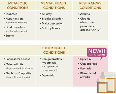 Outpatient treatment for 20 approved chronic conditions under the Chronic Disease Management Programme(CDMP), there is 15% co-payment but no deductible.